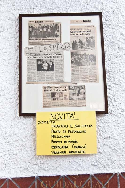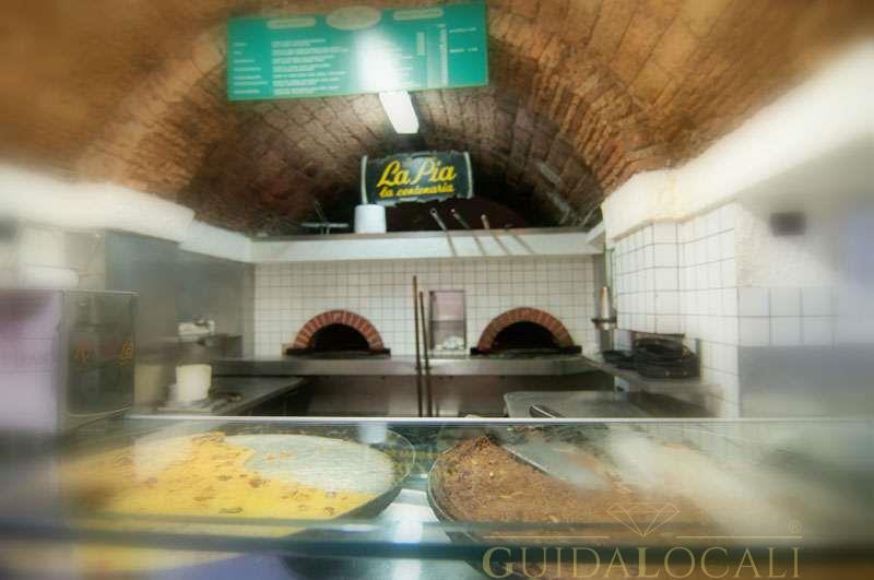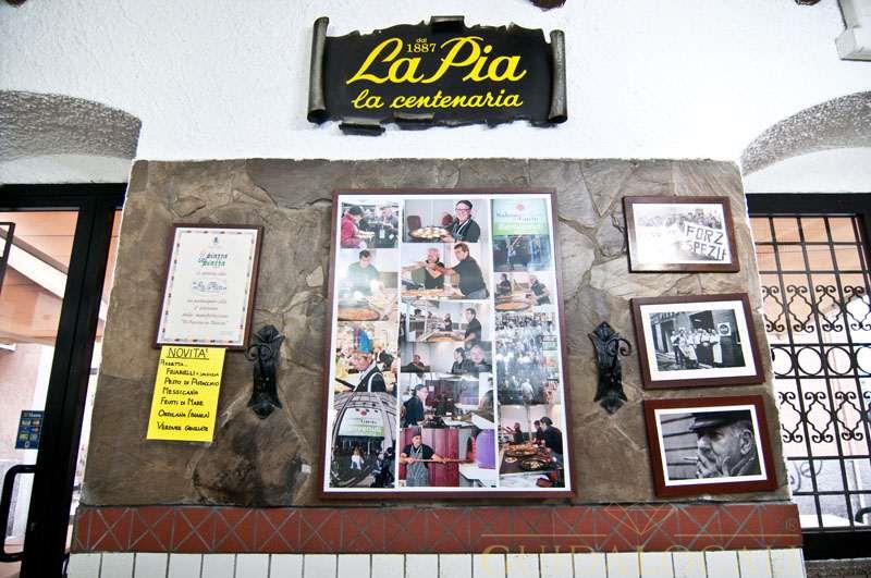 È nel 1887 che la Signora Pia apre un piccolo locale in Via del Prione per la vendita di farinata, di focaccia e castagnaccio; cibo per la "povera gente": operai, manovali, carrettieri e artigiani. La Spezia in quegli anni era al massimo del suo sviluppo mercantile, come punto di riferimenti per i traffici marittimi. C’era il porto con il suo via e vai di navi e di merci; i cantieri navali con la costruzioni di navi sia civili che militari. Nel corso degli anni La Pia diventa il punto di riferimento di tanti lavoratori spezzini. Infatti con qualche centesimo, si poteva avere "'n toco de fugaza, na feta de faina' o na feta de patona". Il termine "focaccia" deriva dal latino focàcia, femminile di focàcius, con il significato di "cotta al focolare". Infatti la focaccia si cuoce al forno a legna. La focaccia con il formaggio, in dialetto genovese a fugassa cö formaggio o a fugassa de Réccu, è una specialità di Recco, anche se la sua produzione si estende pure ai vicini comuni del Golfo Paradiso quali Camogli, Sori ed Uscio. Nell'estate del 2011 il prodotto ha ottenuto il marchio europeo dell'IGP (Indicazione Geografica Protetta), certificazione presentata il 14 luglio 2011 negli uffici della Regione Liguria dal Ministero delle Politiche Agricole. La focaccia, secondo la ricetta originale, si prepara con due strati sottilissimi di pasta a base di farina e olio di oliva (senza lievito), farciti con lo stracchino che ha ormai quasi totalmente sostituito l'originaria prescinseûa, prodotto tipico caseario della provincia di Genova, che prende nome dal caglio (presù in genovese) e ha la consistenza tra lo yogurt e la ricotta. Il castagnaccio (in genovese patona) è una torta di farina di castagne tipica delle zone appenniniche di Toscana, Liguria, Emilia e Piemonte. È un piatto autunnale che si ottiene facendo cuocere nel forno un impasto di farina di castagne, acqua, olio extravergine d'oliva, pinoli e uvetta. Varianti locali prevedono l'aggiunta di rosmarino, scorze d'arancia, semi di finocchio o frutta secca. Accompagnamento ideale del castagnaccio sono la ricotta o il miele di castagno, il vino novello, o i vini dolci come il vin santo. Oggi quasi nulla è cambiato di quell’atmosfera calda familiare che ha contraddistinto la Signora Pia. Le volte sono ancora in pietra o in mattoni a botte ben illuminate, il forno è in mattoni refrattari per evitare dispersioni di calore e rendere la cattura omogenea. Possono essere messi in cottura più di due testi in rame per poter sfornare: focacce, focacce al formaggio tipo Recco, castagnaccio e farinate. In tutti i punti vendita c’è la possibilità di consumare il proprio pezzo di focaccia nella sala interna o nel dehor seduti al tavolino.